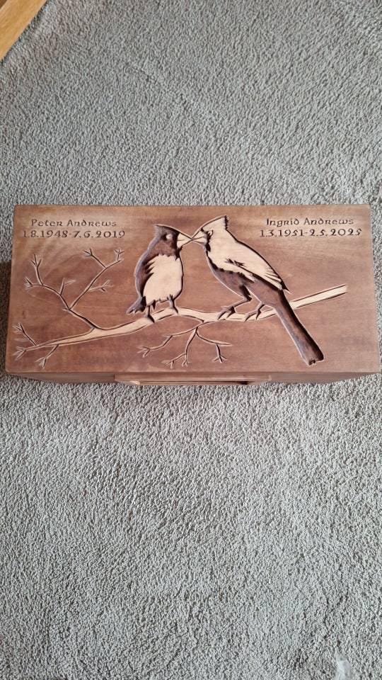 The box is beautifully crafted the person who crafted the box is a very gifted clever person, Just as requested etched on the base and is done beautifully, Thankyou so much my Mum & Dad can finaly be together again.