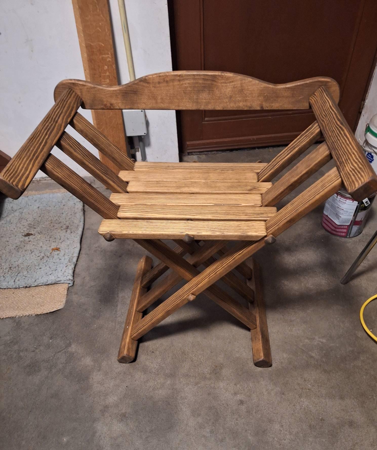 Old dark oak color folding chair. This is a replica of chair used widely in Europe from ancient Rome to XVI century. Frame is made of pine wood and it can be finished with varnish and paint. You can also chose color of your sturdy handmade wooden chair.