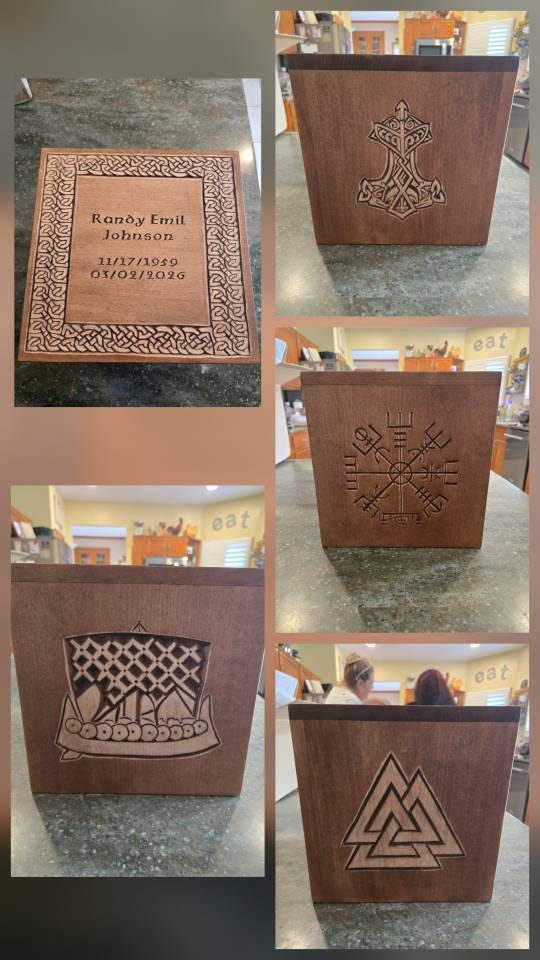 If you are looking for something a bit different from the traditional vase type urn for your loved one - especially for this connected with Viking, Celtic and Pagan ancestors, and you want personalized carved picture - consider a beautiful handcrafted wooden box that will look perfect in your home decor. It is such a lovely way to honor your loved ones memory. It will be fitting for a male or female. It will comfortably fit the remains of an adult that weighed up to 200 pounds. I can also make bigger one for order. On the top of the urn is a place for some carving or metal plate – I can carve text with you want. There is also possible for me to use different patterns on the top and front of the box. Box is closed from the bottom. There is also possible to carve more or less sides of urn. Also it`s possible to finish it with other colors. Fast delivery by DHL.