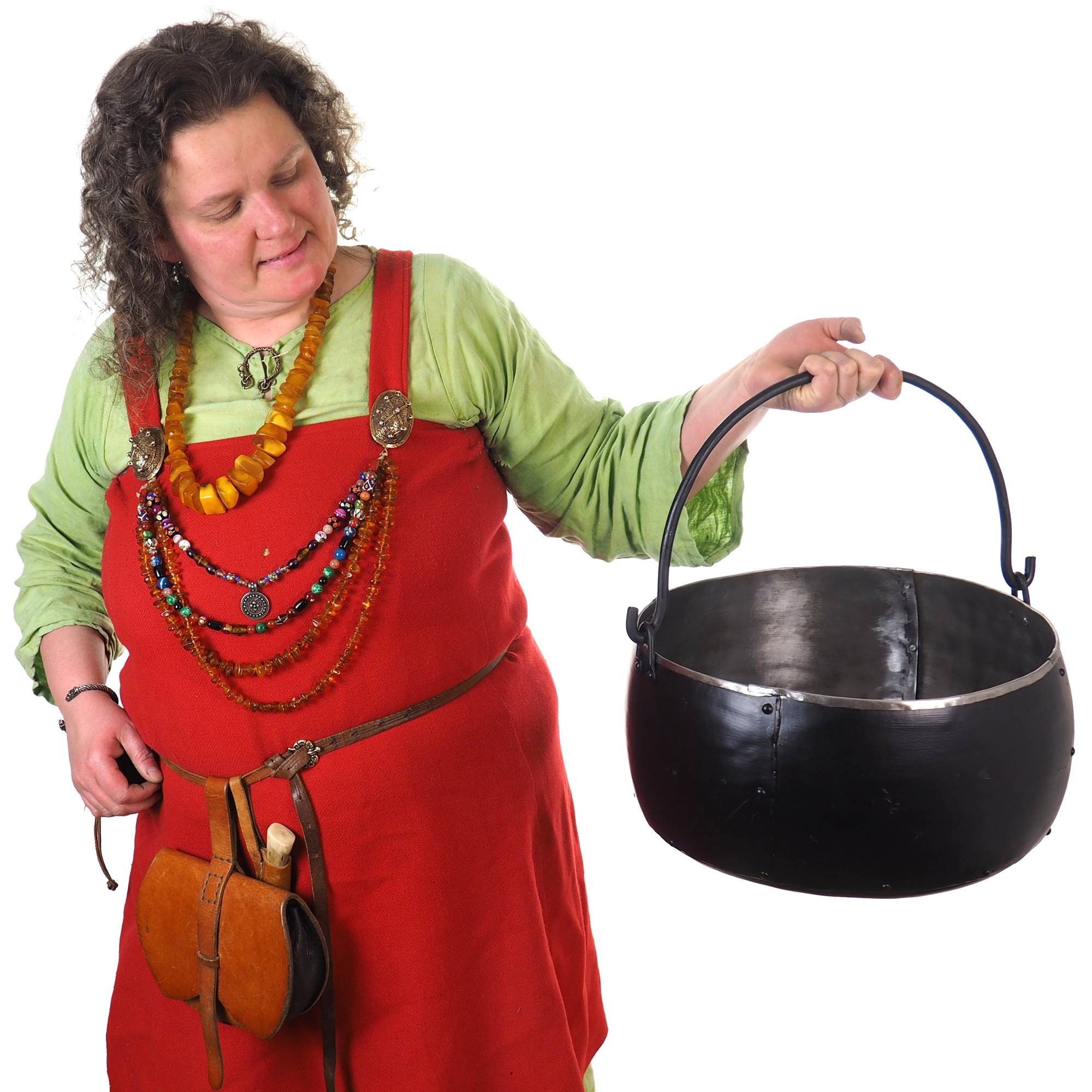 Historically based steel cauldron. Handcrafted. Made of two thin sheets of steel – with is boiling incredibly fast (you have to be careful when you cook to not burn the food). Riveted and additionally welded electrically (waterproof and ready to use). From the outside, covered with heat-resistant paint (do not fall off the fire) This is of course not historically correct but it’s not so visible and it makes life easier because paint it is slippery soot washes off very easily (you don`t have to scrub so hard). Patterned after an archaeological excavations from X c.