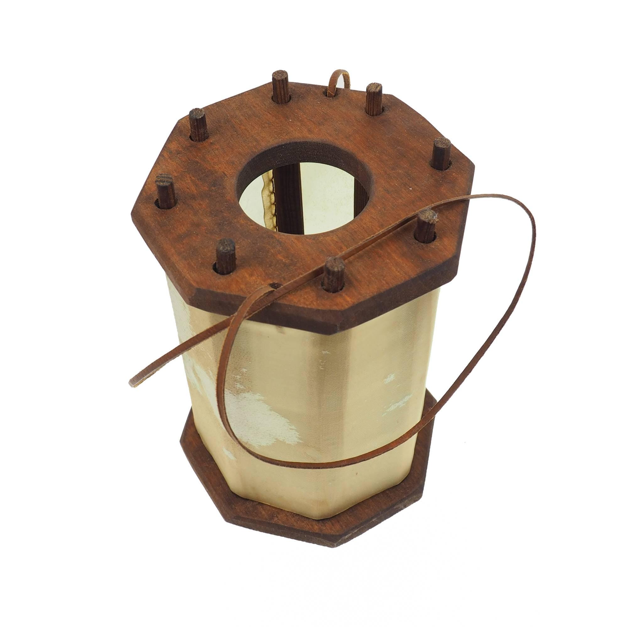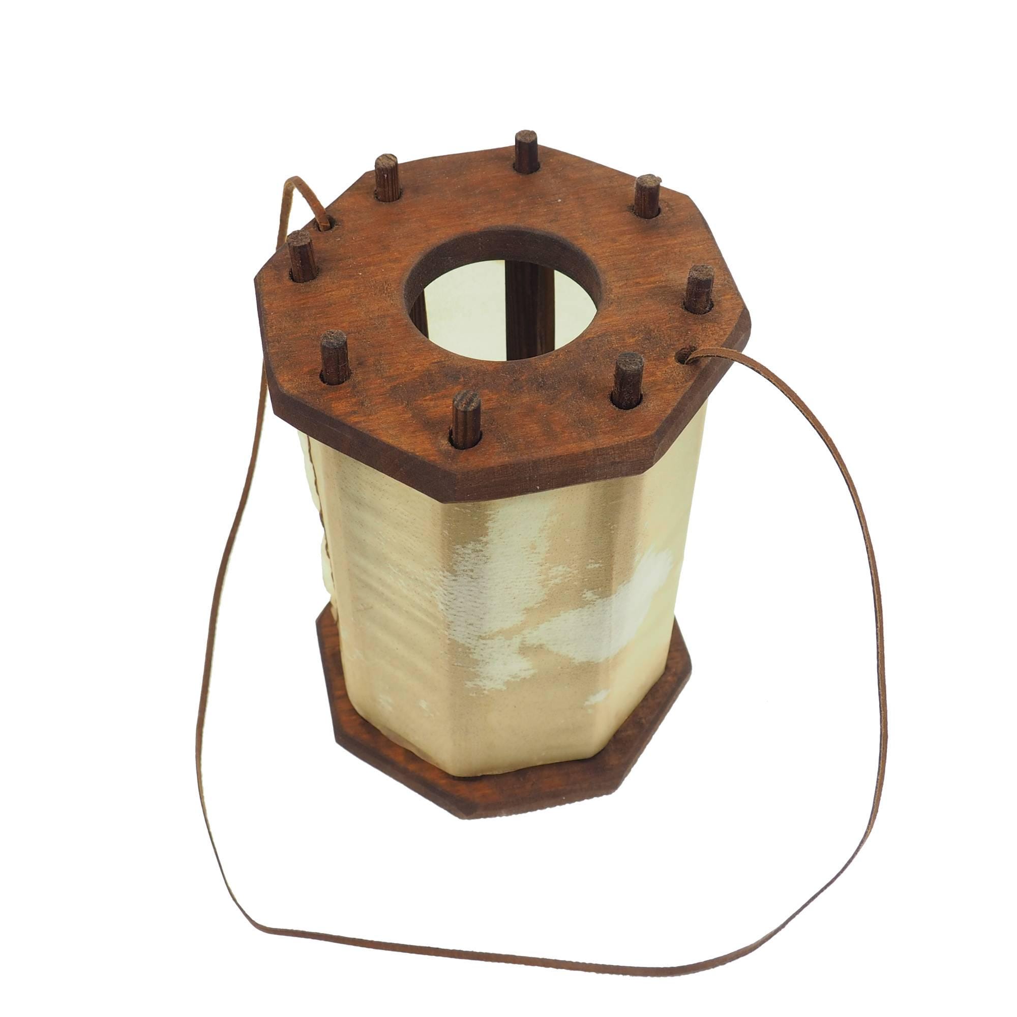 Replica of lantern widely used in Medieval Europe. Pine wood and hand sewn reindeer skin parchment. This lanternhas removable lid at the bottom to put the candle in. Various colors.