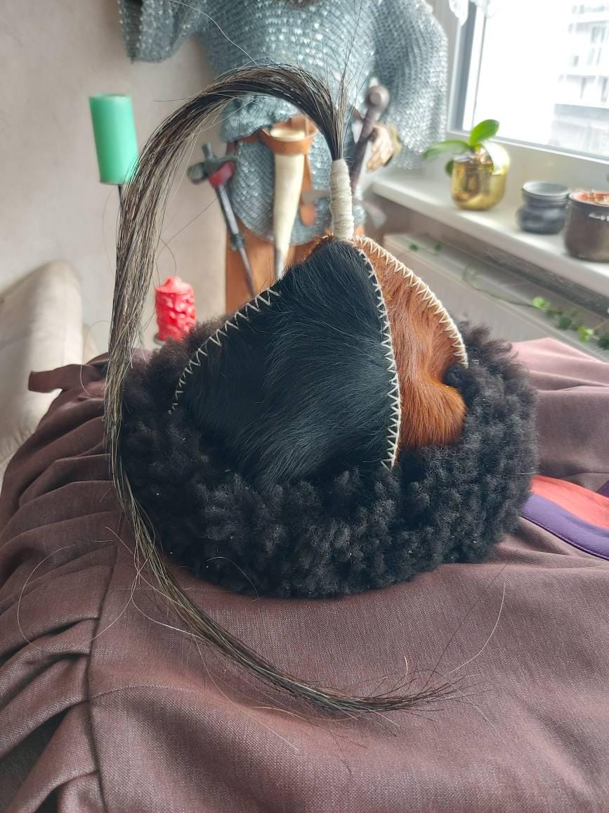 Up for sale custom made historical leather hat with a sheep rim and horse tail. This hat is very warm , perfect for winter frosts. Of course, horse tail is made from the hair coming from live horses, not those that were killed for meat. Near our house is a stable for rent for sport horses and we take hair from the tails modeling.