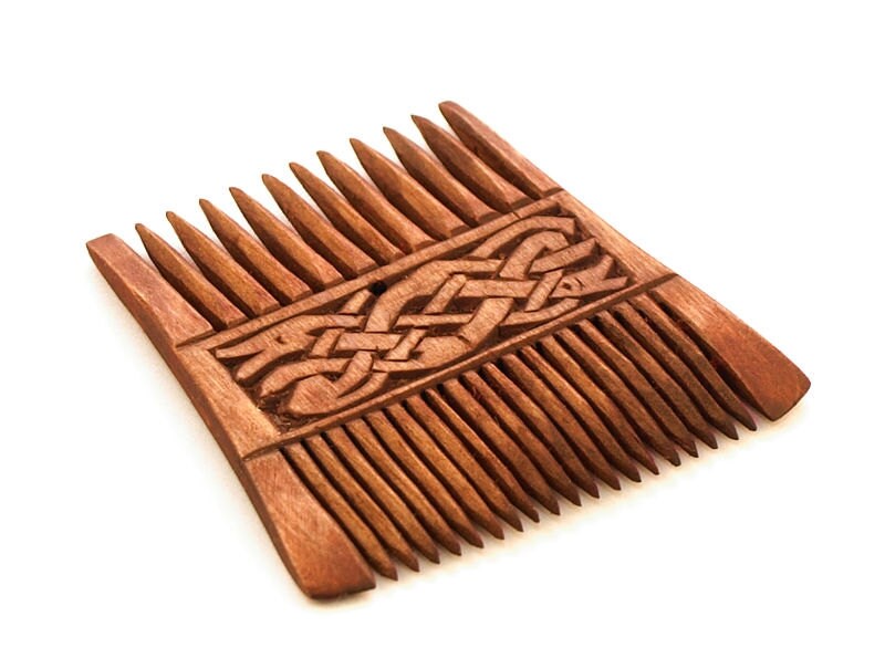 This historical viking wooden comb is carved from alder wood and is finished in linseed oil. Both sides of the comb are almost identical (you know we are craftsmen not a copy maschine). It's completely functional comb and can be used purposefully to comb one's hair. This is a double comb with a teeth narrow and wide. The teeth are tight, but even for normal hair suitable. This comb is very durable and may be used for many years. With the hole in the middle, the comb is easy to fix on a leather string, so you can carry it on a belt.