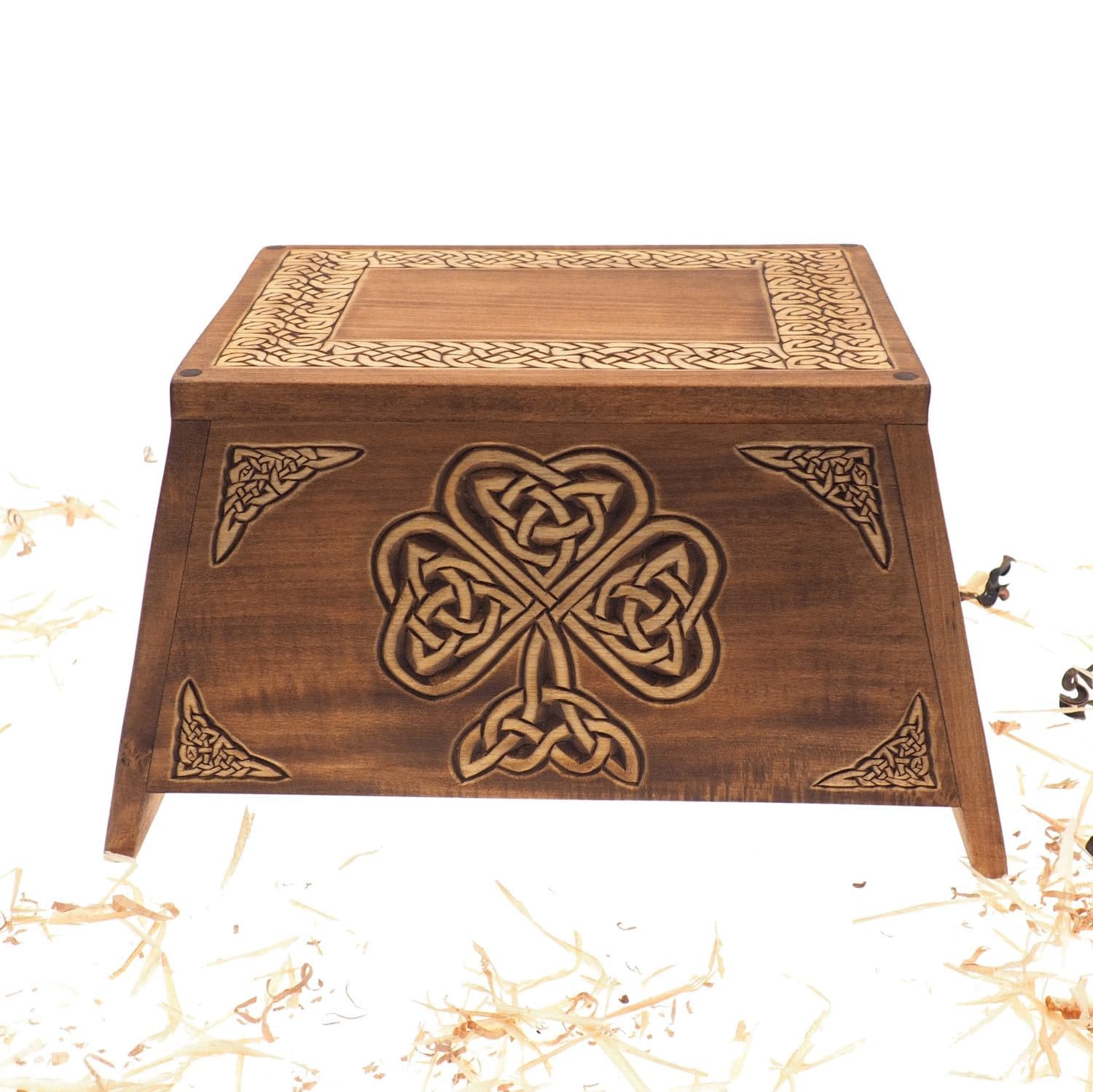 Shamrock Wooden Urn , Memorial Box, Hand Carved, Keepsake Cremation Urns, Burial, Celtic pagan
