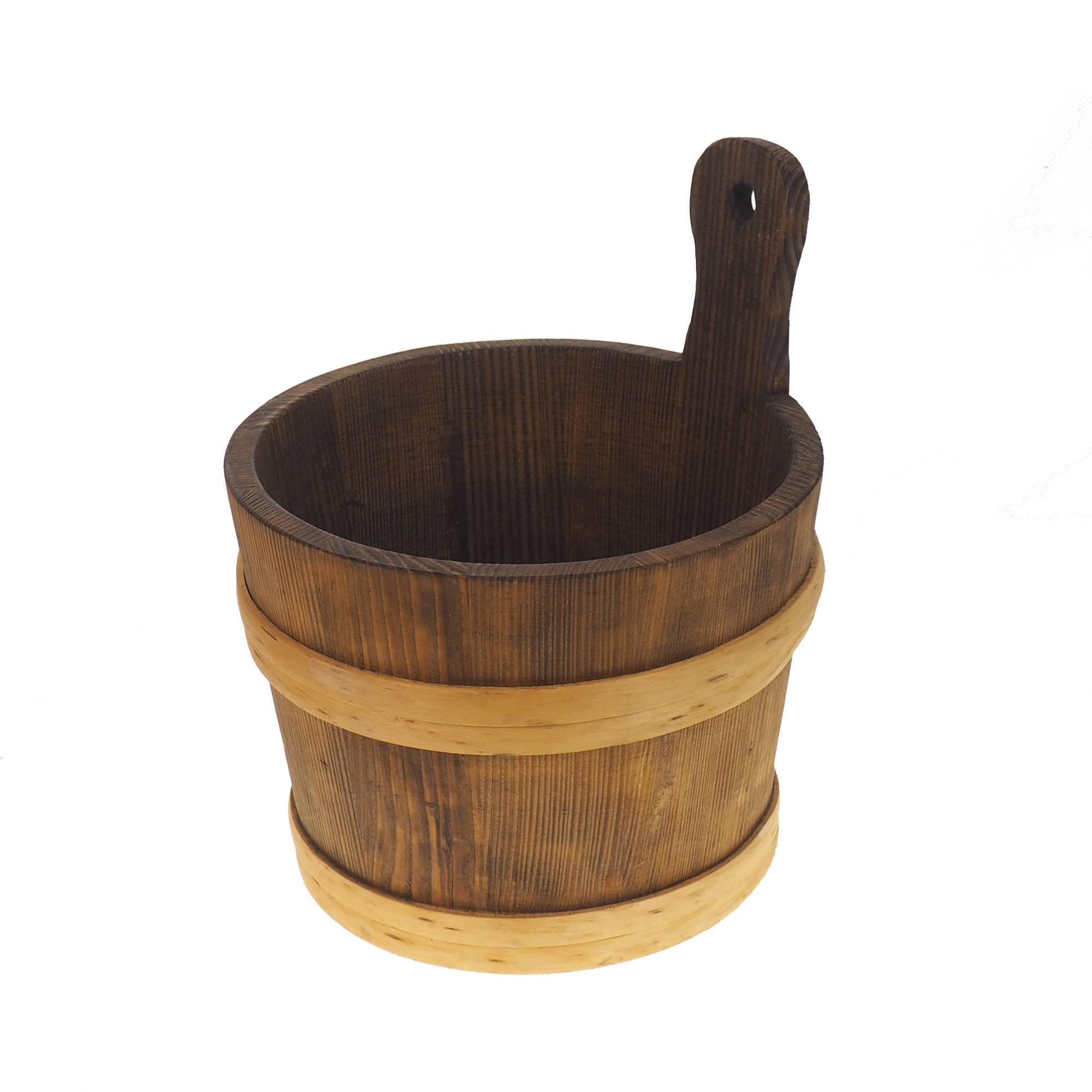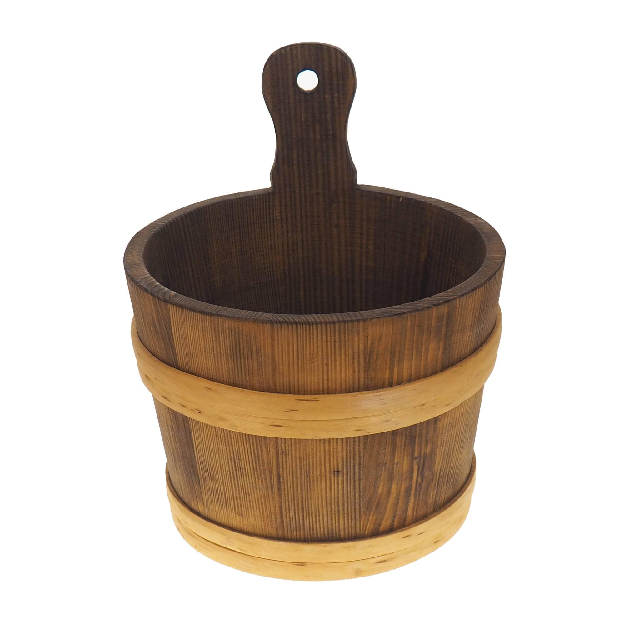 Wooden bucket. Rope handle. Finished with linseed oil for extended waterproof.