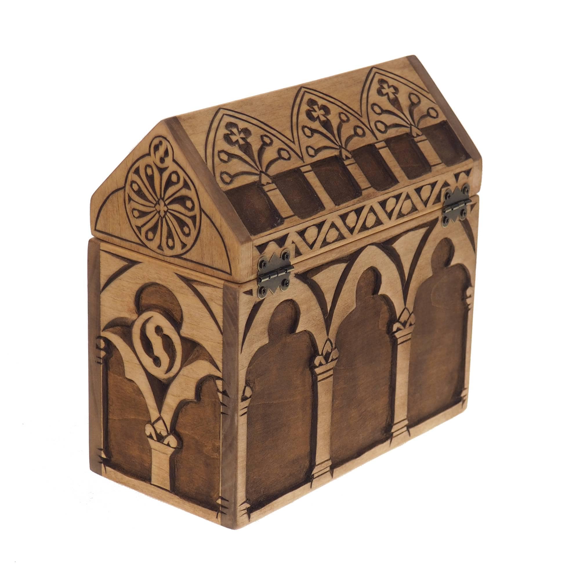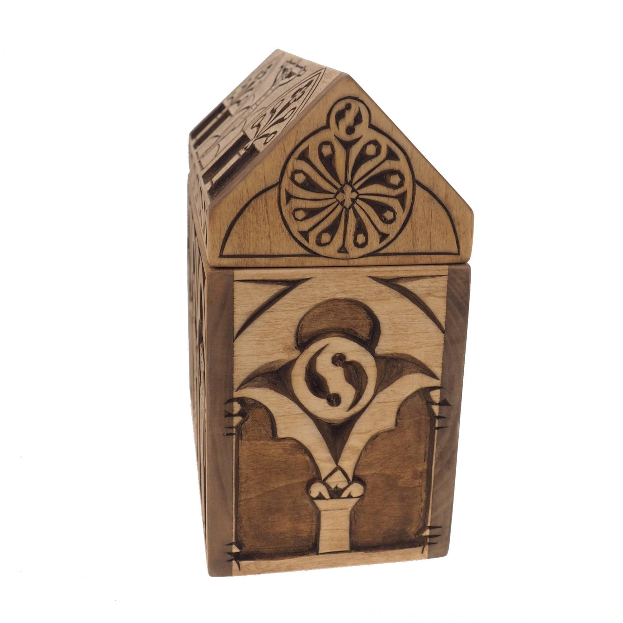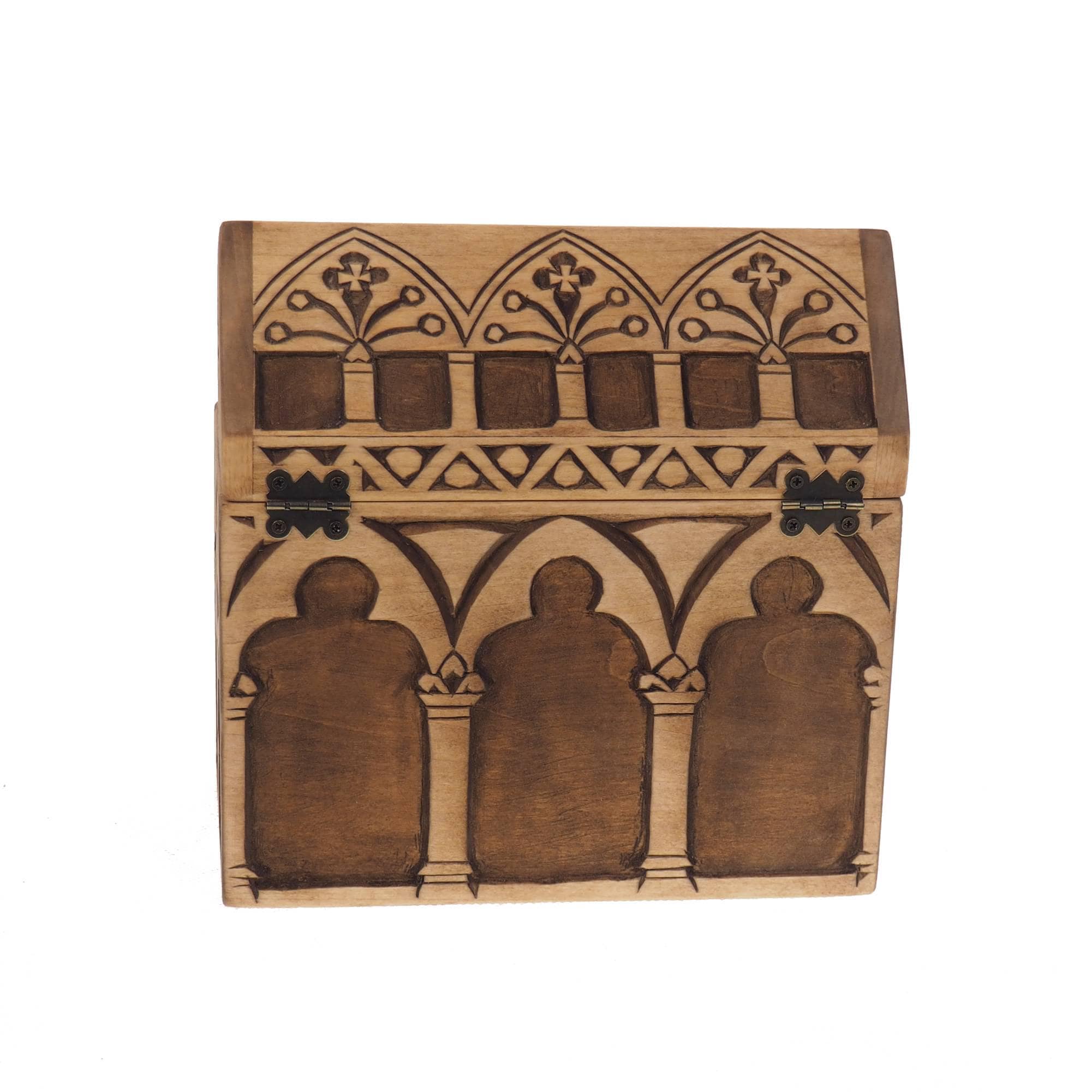 This hand carved Reliquary with Christ and saints and angels motive. Box has been made out of apple wood decorated with pattern from Medieval Knight Codex. Perfect for jewelry storage or keepsake box. It was hand painted and hand sanded. Finished using only natural, historically appropriate materials.