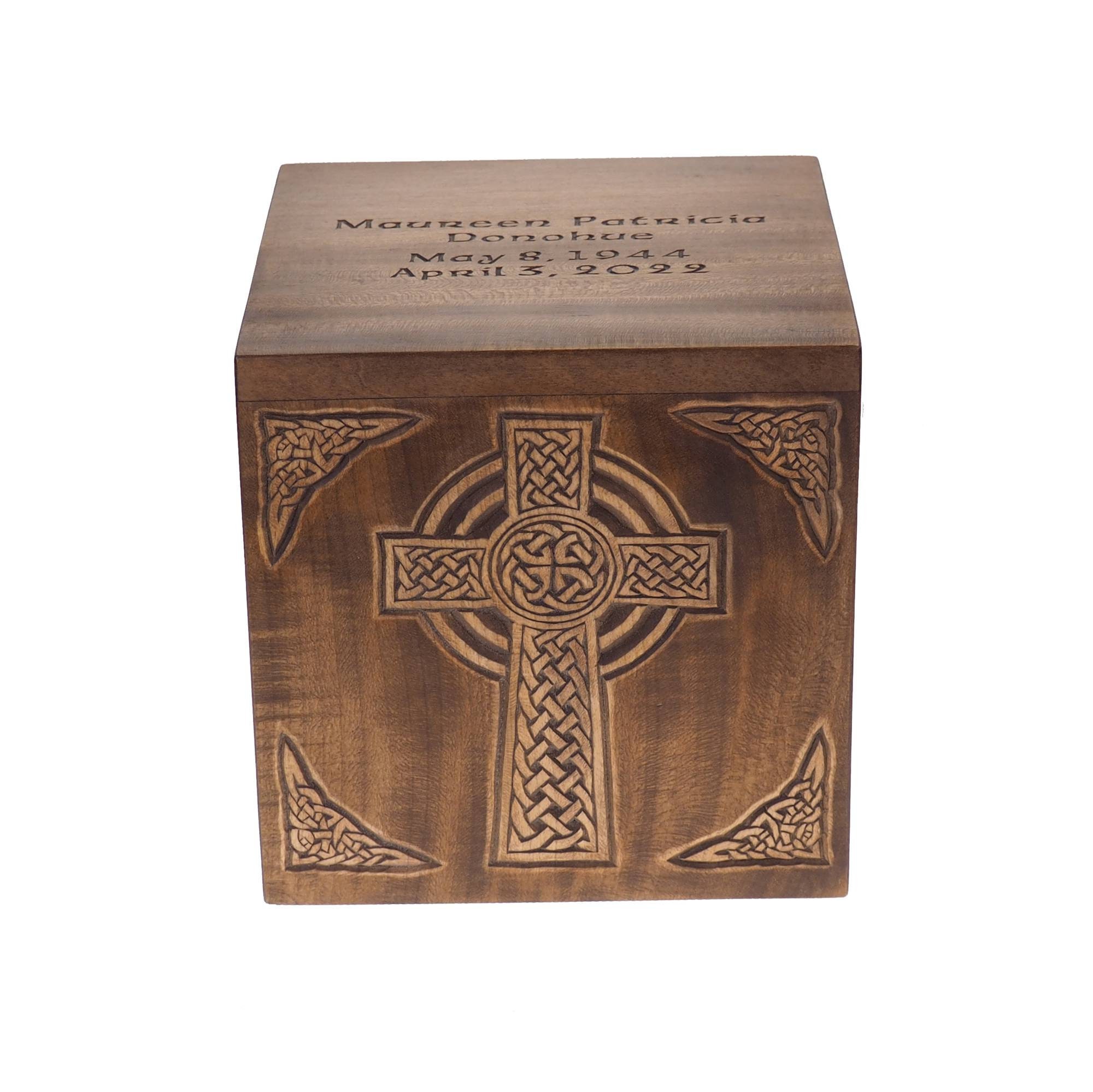 Square Personalized Wood Urn, Celtic Cross, Memorial, Carved Keepsake Cremation, Medieval Viking
