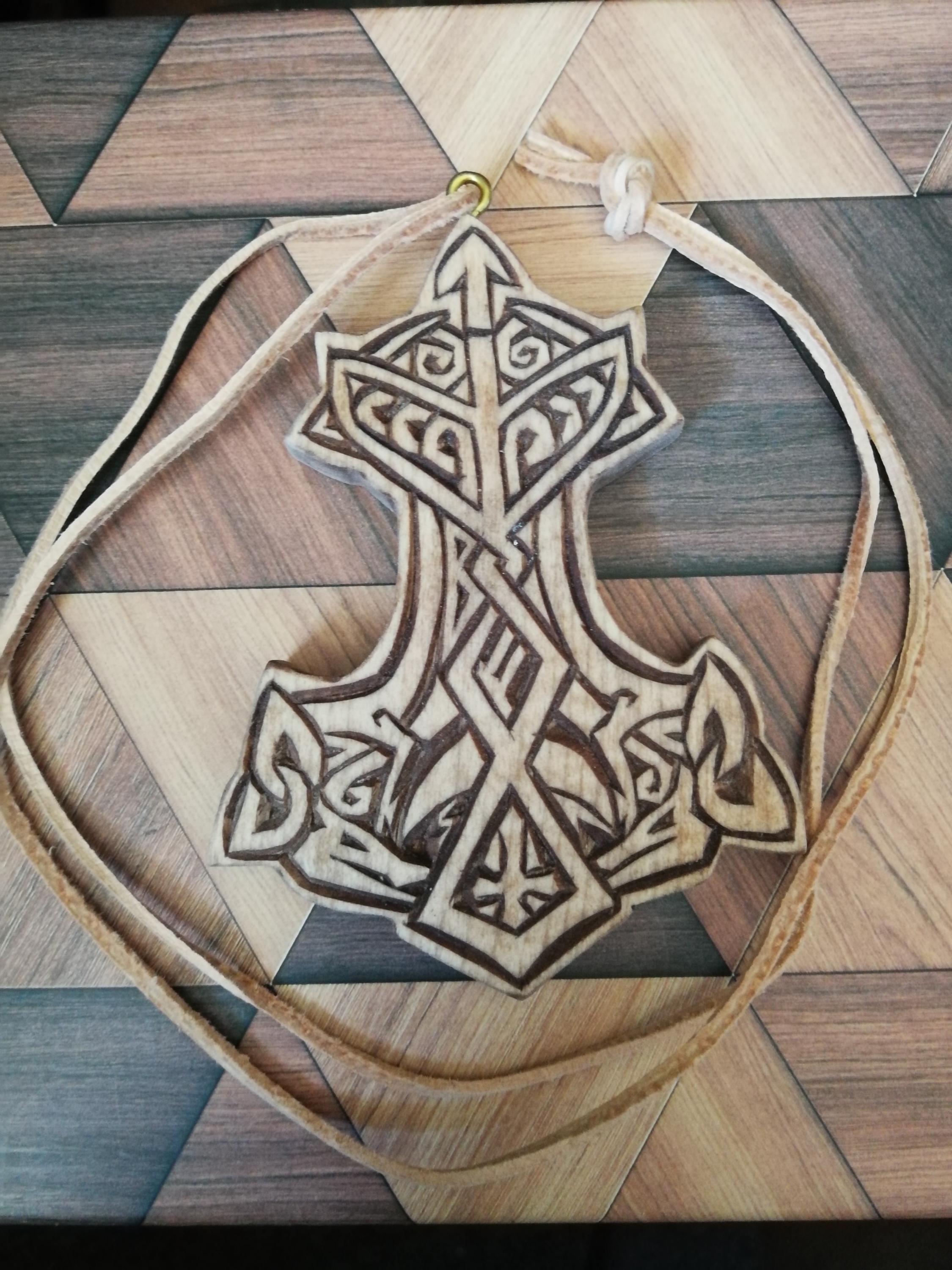 Hand carved small Thor hammer pedant carved in wood with and leather strap.